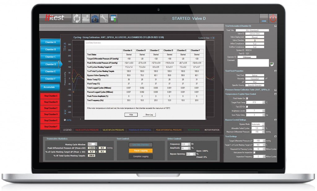The ViVitro Heart Valve Durability Tester with Automatic Dual Control Technology uses a proprietary software platform with a user- friendly interface. All in-software allows individual control of each test module.